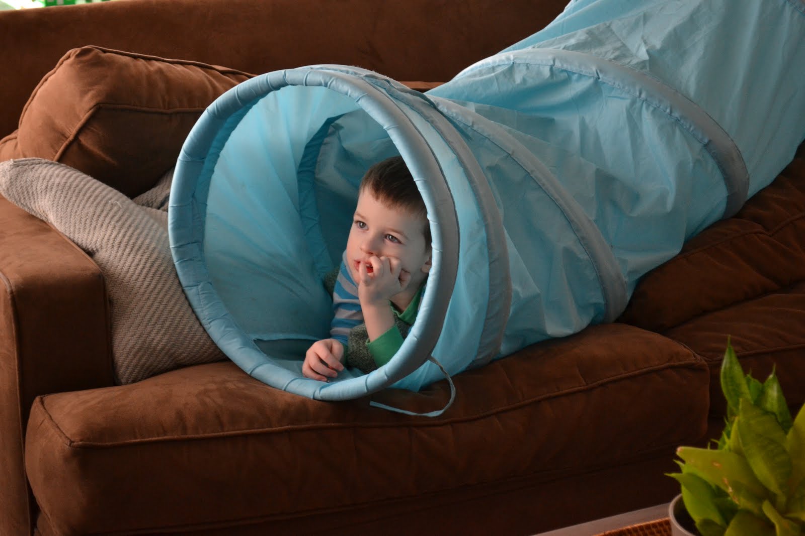 Then, he decided to play in his tunnel for a while. He was pretending that he was a caterpillar. For some reason this involved shoving many stuffed animals and pillows into the tunnel with him, and then insisting we seal off either end with "doors" while he lay inside for a while: